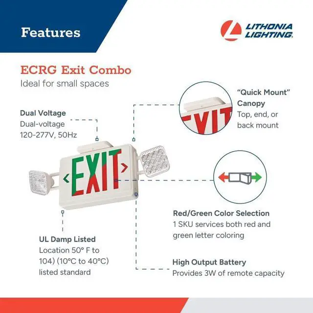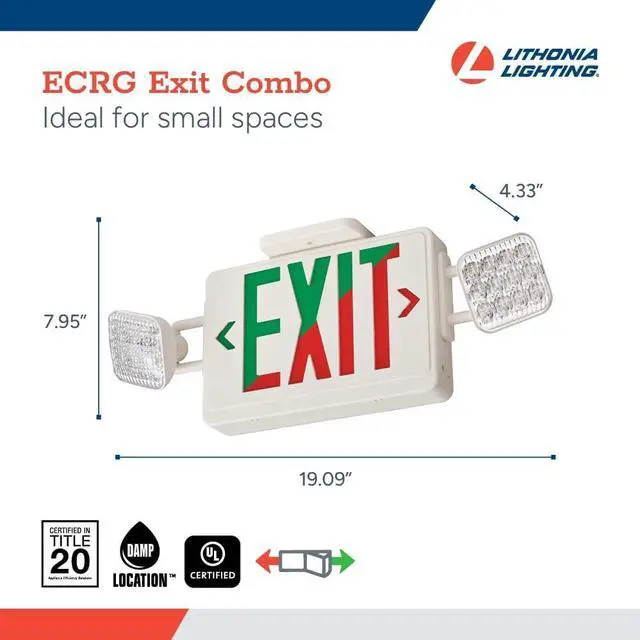 - 2-IN-1 LED EXIT SIGN AND EMERGENCY LIGHT: The Lithonia Lighting ECRG offers both red and green lettering along with square LED light heads; It safely lights exit paths in small spaces at lower mounting heights while providing 90 minutes of backup power