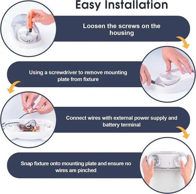 : 120V-347V universal voltage, Backup Battery, Test switch and indicatorUL Listed&Wide ApplicationThe waterproof emergency exit lights approved by UL 924 certificate and comply with commercial grade. Its wet rated design makes it perfect for outdoor use, standing up to various weather conditionsEnsured Quality & Service All SASELUX Outdoor Emergency Light covered by worry-free MONEY-BACK & WARRANTY policy which support 5years for electrical boards and housing with professional after-sales service- Wet Location Rated & Fully Adjustable Two HeadsThe Wet Location emergency light with removable waterproof EVA foam protective covers prevent most water, UL-94V-0 Flame-retardant and high impact thermoplastic emergency light available in Wet location with seamless silicon gasket. 360 degree rotation Adjustable lamp heads allow this emergency light to be pointed in any direction needed.