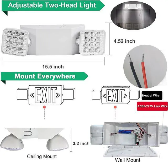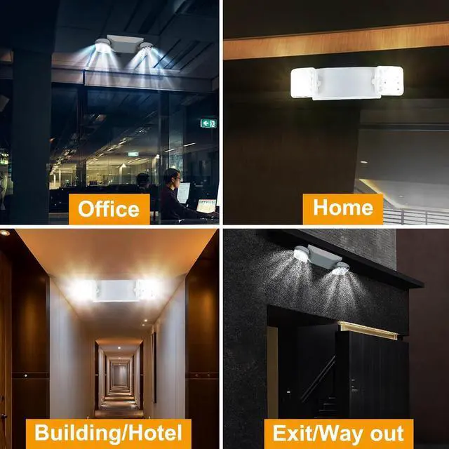 - Adjustable-angle lighting: 2*3W Dual head emergency light fixture Use long-lasting, efficient ultra bright white LEDs. Each side of the emergency light for home power failure has bright adjustable floodlights on the sign for maximum visibility. 360° ratation, the flexibility of the light direction allows you to point the lights at almost a 90 degree angle
