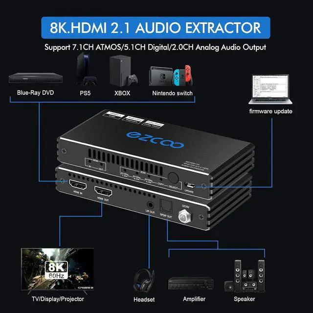 - High CompatibilityPlug & Play, no driver; 8K HDMI Audio Decoder works perfectly with N-v-i-dia Shield, X-f-inity box, Game Capture, A-pple TV, F-ire TV, PS3/ PS4 Pro, PS 5 X-box series X, Switch desktop audio extract etc; Compacted design for portable, flexible, easy installation.