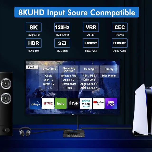 Built-in ESD Protection for safety usage. Include 5V 2A power adapter. // ONLY COPY support VRR. To keep 4K120 stable quality, pls order together hdmi 2.1 cable B0BB78BFNJ as well- Professional 8K 4K 120Hz HDMI Audio Extractor for PC Game HeadphoneHDMI EDID Switch panel button select 4K 120Hz 7.1 / 5.1 / 2.1 ch audio/ COPY mode easily for 8K monitor, projector, TV-- CEC control -- Supports D-o-l-b-y Digital 7.1CH, D-o-l-b-y Atmos, DTS: X Audio --