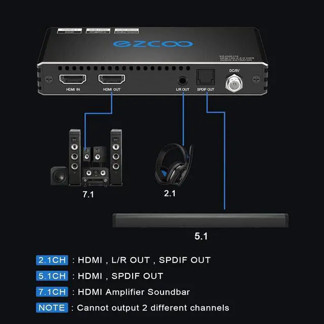 KEY USAGEIF play 2.1CH audio, SPDIF & 3.5 mm audio play 2.1 ch in sync; IF play 5.1CH audio, SPDIF 5.1CH is on, 3.5 mm 2.1CH is off---IF play 7.1CH /Atmos, just HDMI OUT stream out --HDMI output ATMOS neither work together with SPDIF 5.1 ch nor 3.5 mm 2.1CH. It`s not audio down-mixer -- Pls use good HDMI 2.1 48Gbps cable less than 3m /10ftHigh CompatibilityPlug & Play, no driver; 8K HDMI Audio Decoder works perfectly with N-v-i-dia Shield, X-f-inity box, Game Capture, A-pple TV, F-ire TV, PS3/ PS4 Pro, PS 5 X-box series X, Switch desktop audio extract etc; Compacted design for portable, flexible, easy installationEZCOO Efficient on-line technical support Click EZCOOTECH to get Seller Technical Support by AMZN Message.