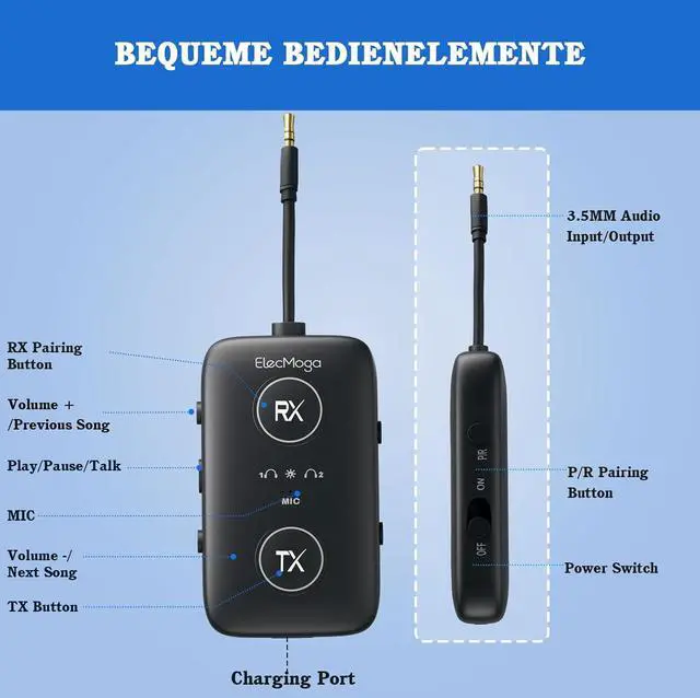 - 2-in-1 Bluetooth Transmitter: Supports Bluetooth transmission and reception, i. e. TX and RX modes. In TX mode, you can easily turn non-Bluetooth-enabled TVs, computers, and fitness/flight equipment into Bluetooth transmitters. In RX mode, connect to your cell phone, Bluetooth gaming device or tablet via non-bluetooth devices such as wired speakers, stereos, car and boat audio systems, etc.