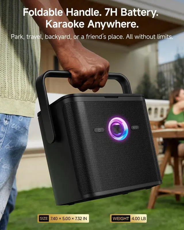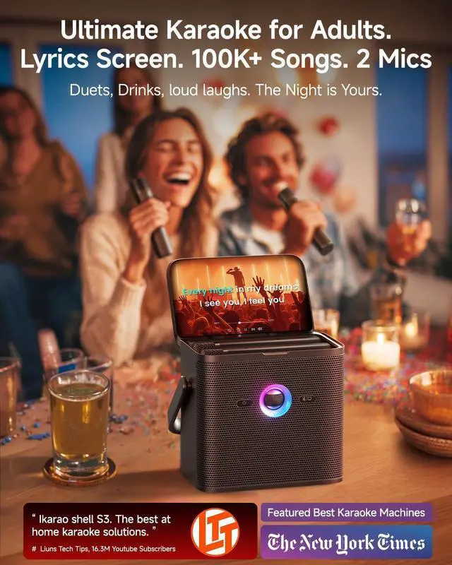 YOUR BEST KARAOKE CHOICE: The Ikarao Shell S3 karaoke machine for adults features a built-in screen, lyrics display, and karaoke system. Its latest AI vocal remover lets you turn any song into a backing track with a single tapno need to search for karaoke versions. Paired with Autotune pitch correction and echo effects, your voice will sound like a star singer. The 80W karaoke speaker delivers powerful sound. A foldable handle and 7-hour battery let you take karaoke fun from indoors to outdoors
