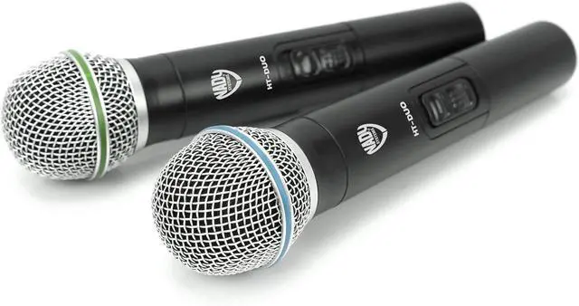 DKW DUO HT B/D VHF Dual Wireless Handheld Microphone System includes 2 microphones, AC adapter and audio cable Easy setup Karaoke, performance, presentation, public address