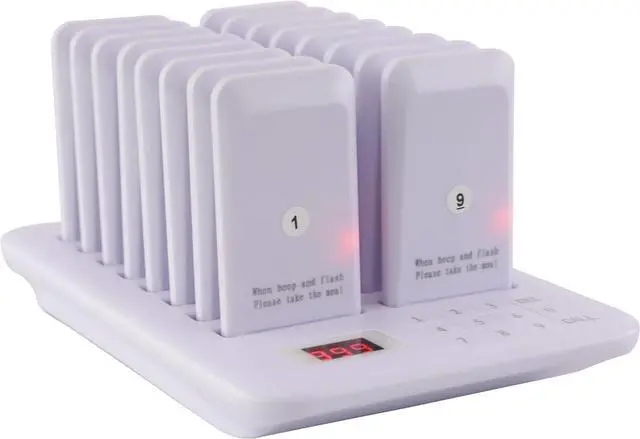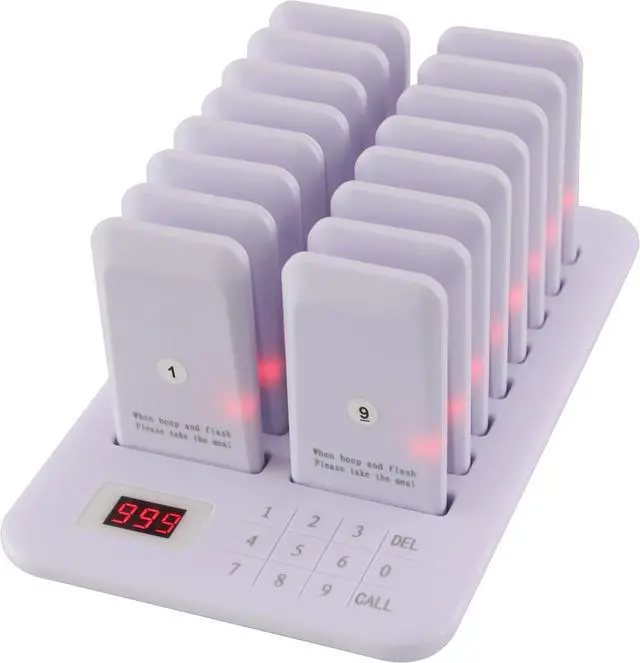 Long Working Distance --- The LOUKIENE wireless paging system allows you to reach customers or staff up to 300 meters / 984 feet away with beeps, vibrations and flashing alerts on 16 pagers and beepers. falseLong Standby Time --- Each pager features a built-in 3.7V /200mAh rechargeable battery with a stacked charging design, eliminating the need for frequent battery changes. With a full charge, the receiver can work frequently for about 20 hours. falseOne-touch Group Shutdown Function --- LOUKIENE pagers can shut down all pagers in the charging base by simply entering the number 999 and pressing the call button.