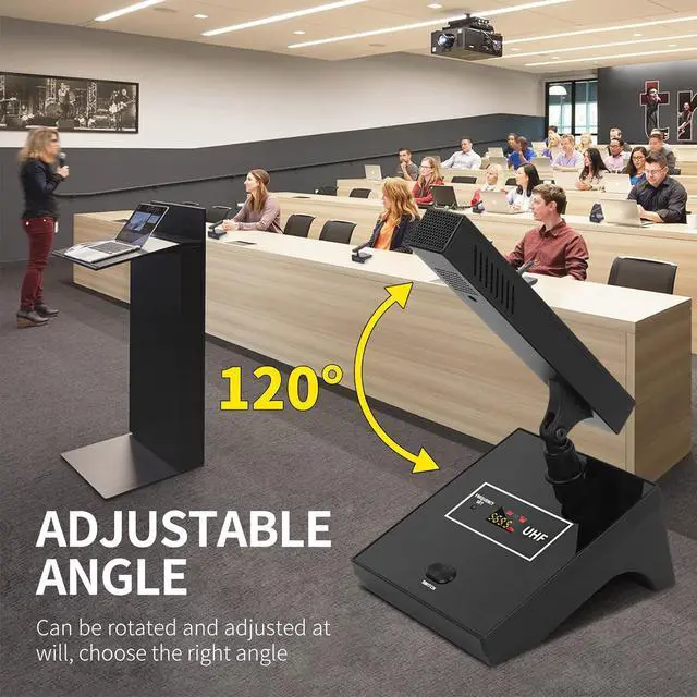 8 Channel UHF Wireless Network, Infrared Automatic FrequencyWireless Conference Microphone Built-in advanced sweep function, automatically skip the frequency and other clutter frequencies in use to avoid string frequent interference, 8 channel wireless microphone system Working frequency ranges in 540MHz- 599.5MH z, 15 requency bands per channelfalseIndependent mic volume control: Individual volume control to precisely balance and adjust vocal sound. Equipped with an LED liquid crystal display, work parameters in real timefalseMultiple output: Metal receiver features 1 XLR output 1 MIX Output and 8 Audio Onputs jack to connect to your amplifier, mixer, or other PA system. Suitable for all kinds of occasion, Conference/Speech/Teaching etcfalse- Wireless Conference MicrophoneUHF 8-Channel conference wireless microphone can be adjustable frequency and four professional antennas with high frequency stability and accuracy. The PLL digital phase-locked loop multi-channel frequency synthesis technology has small interference, more reliable transmission. Metal housing, durable