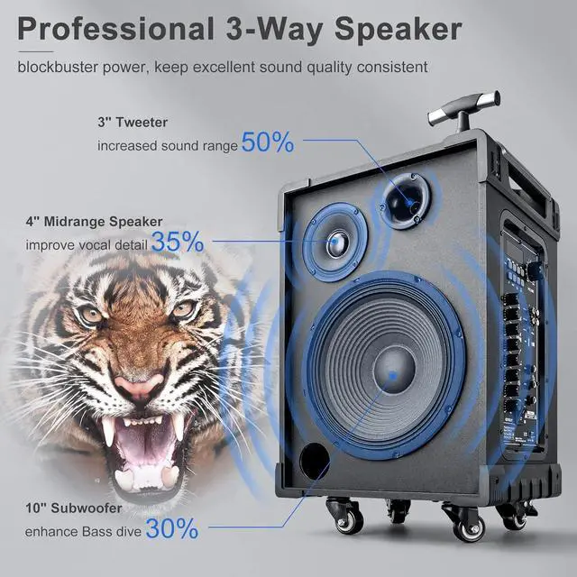 - Easy to Move, Built to Party Designed with portable wheels and a top handle, this portable Bluetooth PA system is ideal for outdoor wireless speakers for parties, church, or tailgates. Rechargeable battery keeps your event going anywhere.