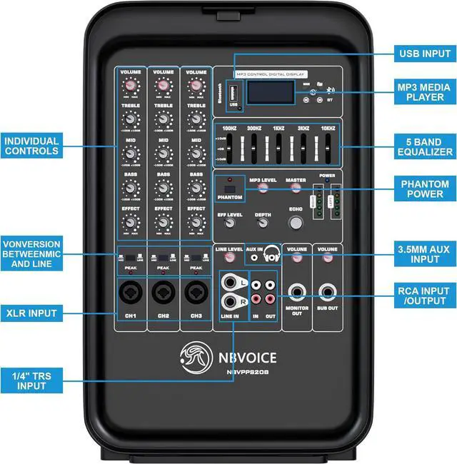 The lightweight, suitcase-style design makes transport and setup a breeze. Carry the entire system with one hand and enjoy high-quality audio coverage wherever you go, without the burden of bulky equipment. Ideal for portable PA system or on-the-go karaoke. falseWith Bluetooth 5.3 connectivity, our product lets you stream audio from your mobile device. DJ a party right from the dance floor or play pre-recorded material for your meeting, worship event, or health cluball without the hassle of wires. falseInputs: combo ¼ / XLR (x4), ¼ balanced TRS (x4), RCA jacks (x1 pair), 3.5 mm jack (x1);