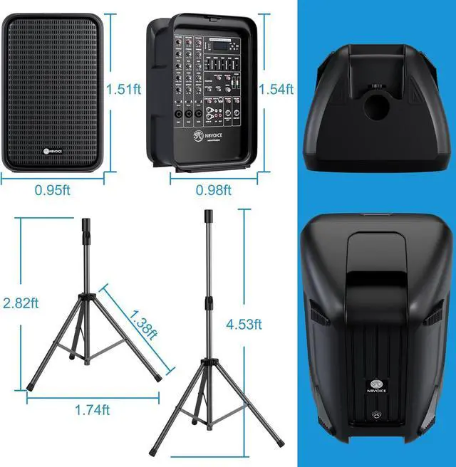 - What's in the BoxPurchase includes: 2 * 8" ABS molded PA speakers with amazing sound, 1 * 8 Channel Self-powered Detachable Mixer, 2 * Foldable Speaker Stands, 1 *6 foot Speaker cables, 1 * Metal wired microphones, 1*wireless remote control, 1* 16.39 foot microphone cable, 1 * Manu