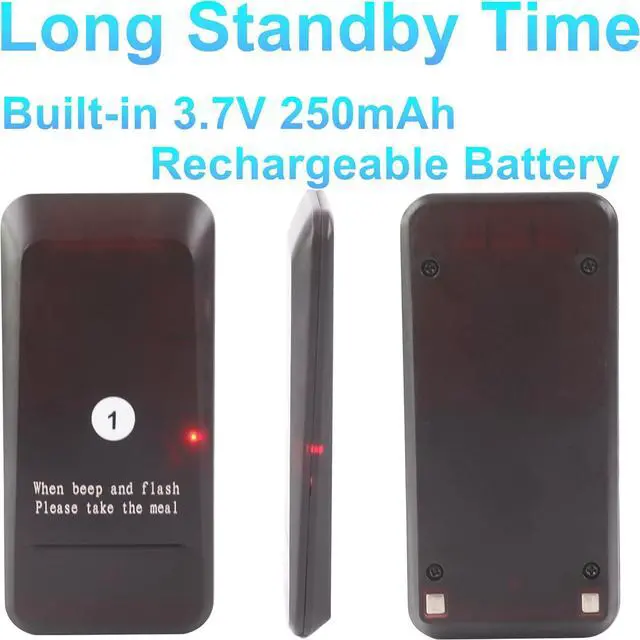- Long Standby Time --- Each pager features a built-in 3.7V /200mAh rechargeable battery with a stacked charging design, eliminating the need for frequent battery changes. With a full charge, the receiver can work frequently for about 20 hours.