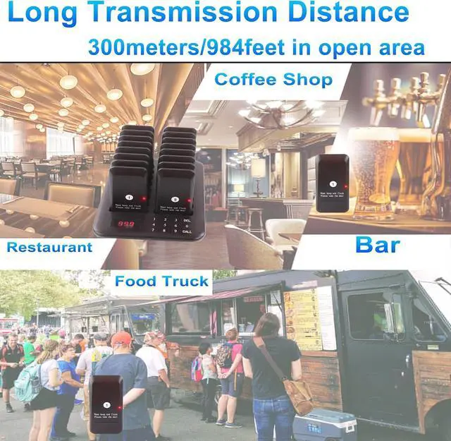 - Long Working Distance --- The LOUKIENE wireless paging system allows you to reach customers or staff up to 300 meters / 984 feet away with beeps, vibrations and flashing alerts on 16 pagers and beepers.