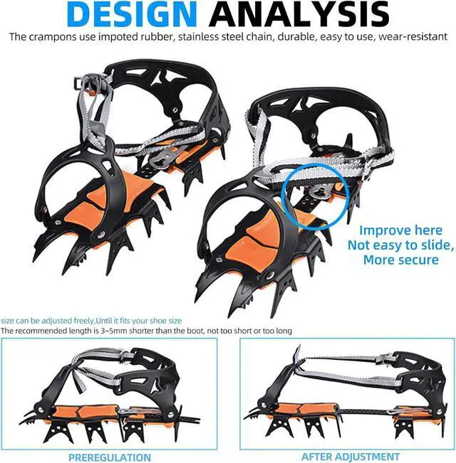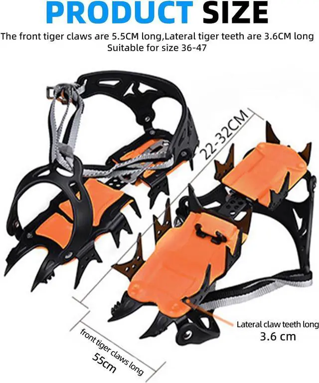 Good performanceLightweight, allowing you to walk naturally, improving stability or reducing the risk of injuryfalsePreferred by hobbyistsGreat for winter outdoor enthusiasts, hunters, ice fishermen, snowmobile drivers, etc. falseService GuaranteeIf you have any questions about the product, you can contact us, we will provide you with professional and detailed answers. false- Peak ClimbersStainless steel eighteen teeth outdoor ice claws, firmly rooted, stable grip, cold-resistant not to break, efficient protection of travel safety issues