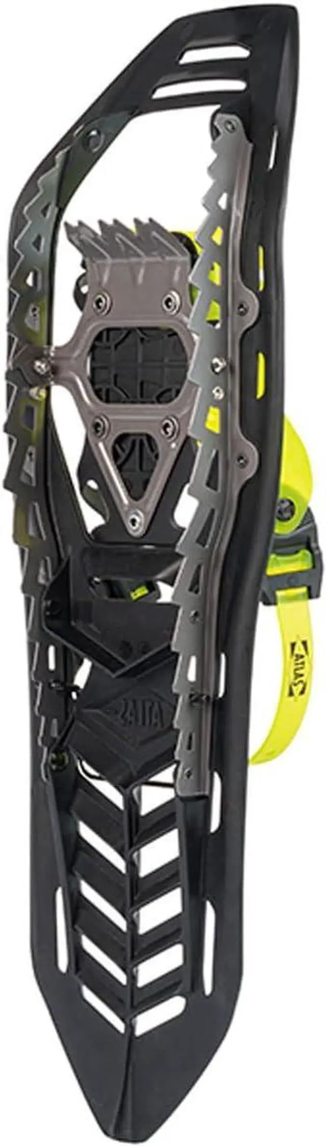 Helium Trail Crampon - Gives snowshoers the needed grip for excursions down less extreme trails. The fore-foot alignment of the tempered steel tangs provides stability and ribbing allows the crampon to shed snow more effectively. falseTraction Rails - Run 2/3 length of snowshoe providing stability and control in all conditions, while still allowing tail to flex for natural gate. false12 Degree Heel Lift - Provides relief when climbing those long steep hills, and easily stores for flats and descentsfalseAtlas Helium Trail Snowshoes