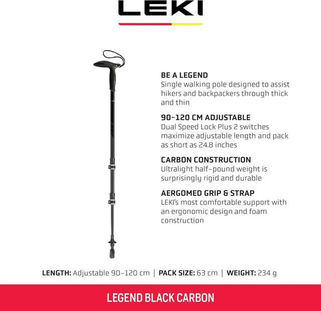 Carbon Construction | Ultralight half-pound weight is surprisingly rigid and durable. falseAergomed Grip & Strap | LEKIs most comfortable support with an ergonomic design and foam construction. falseSpecs | [Activities] Trekking, Hiking; [Length] 90-120 cm; [Pack Size] 24.8 in; [Weight] 8.25 oz; [Material] Carbon (PRC 1000); [Locking System] Speed Lock 2 Plus; [Basket] Nordic; [Tip] Flex Tip Short (Carbide), Rubber Pad TrekkingfalseThe LEKI Legend Black Carbon Walking Pole provides LEKIs trusted trail performance in a cane style for those who need more assistance than your average trekking pole.
