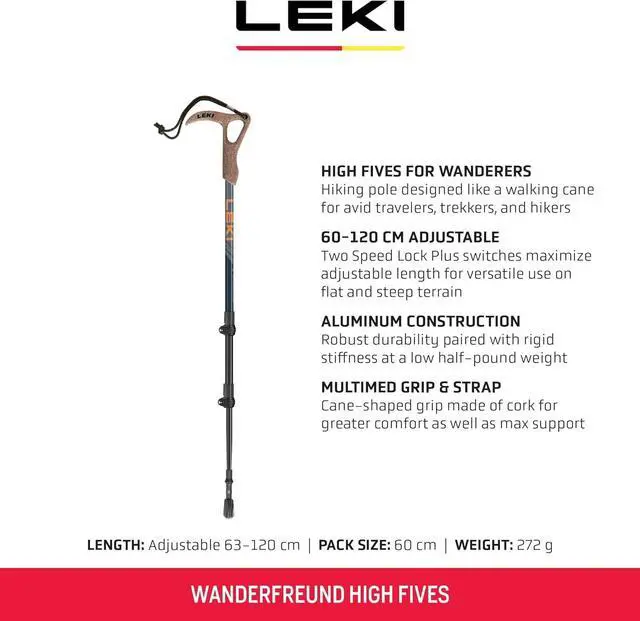 Aluminum Construction | Robust durability paired with rigid stiffness at a low half-pound weight. falseMultimed Grip & Strap | Cane-shaped grip made of cork for greater comfort as well as maximum support. falseSpecs | [Activities] Trekking, Hiking; [Length] 60-120 cm; [Pack Size] 23.6 in; [Weight] 9.6 oz; [Material] Aluminum (HTS 6.5 ); [Locking System] Speed Lock Plus; [Tip] Flex Tip Short (Carbide), Rubber PadfalseThe LEKI Wanderfreund High Fives Trekking Pole is the perfect option for hikers who need a cane for extra support. It adjusts from 60-120 cm and packs down to 23.6 inches with two Speed Lock Plus latches for compact packability and versatile use on variable terrain.