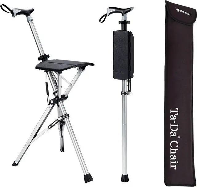 VERSATILE USE: Ta-Da chair is a versatile product that simultaneously provides outdoor lovers with a seat for resting and a hiking stick for support. This design, which instantly converts a hiking stick into a chair with a snap, offers rest for tired legs and knees at a moments notice.