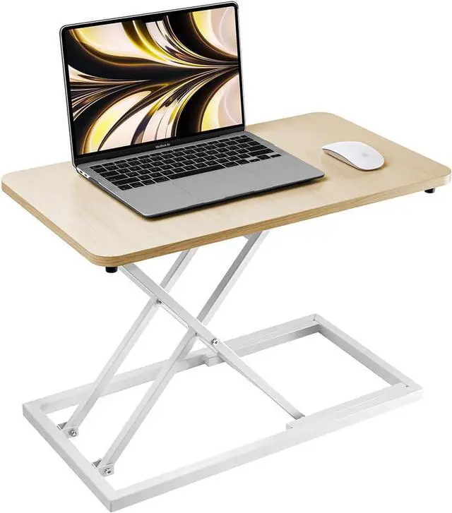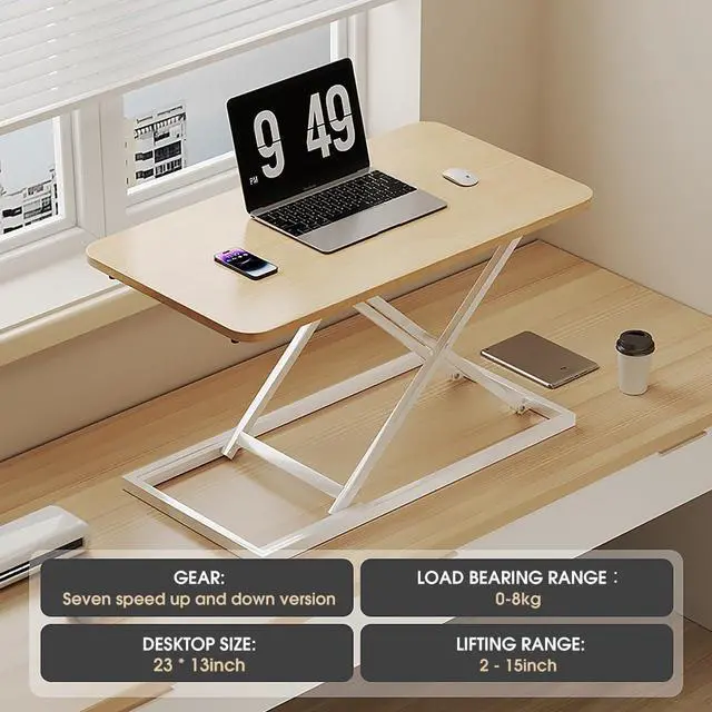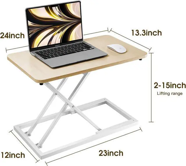- Save Desktop Space The vertical desk converter can transform a traditional sitting desk into a standing desk. The desktop size is 24 inches long, 13.3 inches wide, and the height can be adjusted from 2 to 15 inches.