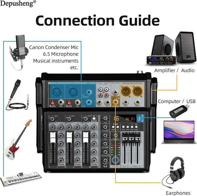 Usb Port Functions: Compatible With Computers, U Disk Mp3 Music Playback, Support Computer Recording. falseThe Mini Mixing Console is great for multiple devices connectivity. 2 XLR Lines input jack to connect mics or guitar, 1 pair L/R 6.35 mm and 1 pair L/R RCA stereo inputs to connect CD plays/keyboard/computer. Plus 1 pair L/R RCA output and 1 pair L/R 6.35 mm Main output and 2*AUX to connect Active Speakers/Power Amplifier/Active sound system/Trolley Active Speaker. falseYou will get1*Audio Mixer, 1*Power adapter, 1*USB to USB cable, 1*Manual. A reminder that the MP3, Bluetooth and USB functions are only available as one of the three options and cannot be used simultaneously. false- 16 High-quality Digital Effects - Built-in effects with 16 professional digital algorithms especially reverb and delay effects, expand the spatial effect of the sound with its outstanding realism and naturalness
