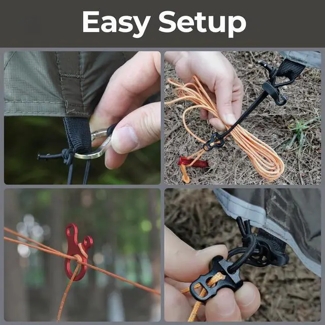 - EASY NO-KNOTS SET UP. Set this tent tarp in seconds without tying a single knot. Its easy to set up and comes with everything you need for an ultimate camping experience. It includes 4 premium aluminum tarp stakes, 6*10ft light-reflective guyline, 4 aluminum guy line adjusters, 4 carabiners with doors cordage attached, and one double-ended stuff sack that holds everything including the tarp for easy storage and mobility.