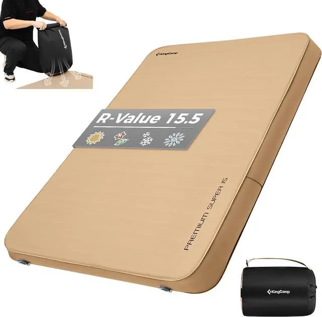 size: 27.6 '' x 13.8 '', weight: 13.7 lbs, fit for 2 people. Compression straps and storage bag included for compact storage and easy transport. Perfect for camping, hiking, slumber parties and overnight guests. falseKeep You Warm Anywhere-R Value 11The double foam sleeping pad features 5.9 inch thick high rebound foam, high R-Value serves you 4 season warm. Offer optimal comfort and warmth your body needs and ensures you won't feel jagged rocks or uneven ground below. Camping nights are no longer sleepless. Like sleeping in my own bed! falsePremium TPU Coating--Durable, Insulated and QuietThe twin self inflating camping mattress enhanced with soft, damp-proof, durable, waterproof, tear-resistant 30D stretch fabric and treated with a TPU coating. TPU coating provides superior insulation and stretching resistance compared to regular PVC, environmentally friendly, durable to use years. Support an insulating layer against the cold ground, eliminate plastic odors and plastic crinkle noises. Give you more peaceful night sleep. falseEnhance your outdoor adventures with the KingCamp Luxury 3D Insulated Double Self-Inflating Camping Sleeping Pad. Designed for two people, this oversized double pad provides optimal comfort with a spacious size of 79.1 '' x 50.3 '' x 3.0 ''.