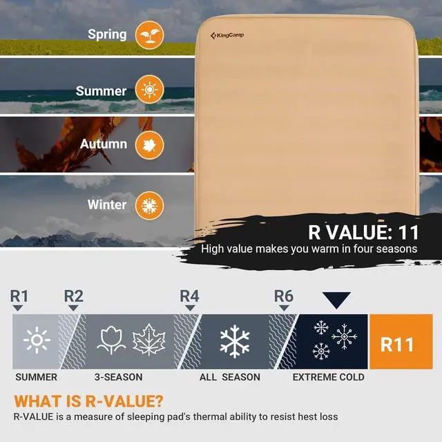 - Keep You Warm Anywhere-R Value 11The double foam sleeping pad features 5.9 inch thick high rebound foam, high R-Value serves you 4 season warm. Offer optimal comfort and warmth your body needs and ensures you won't feel jagged rocks or uneven ground below. Camping nights are no longer sleepless. Like sleeping in my own bed!