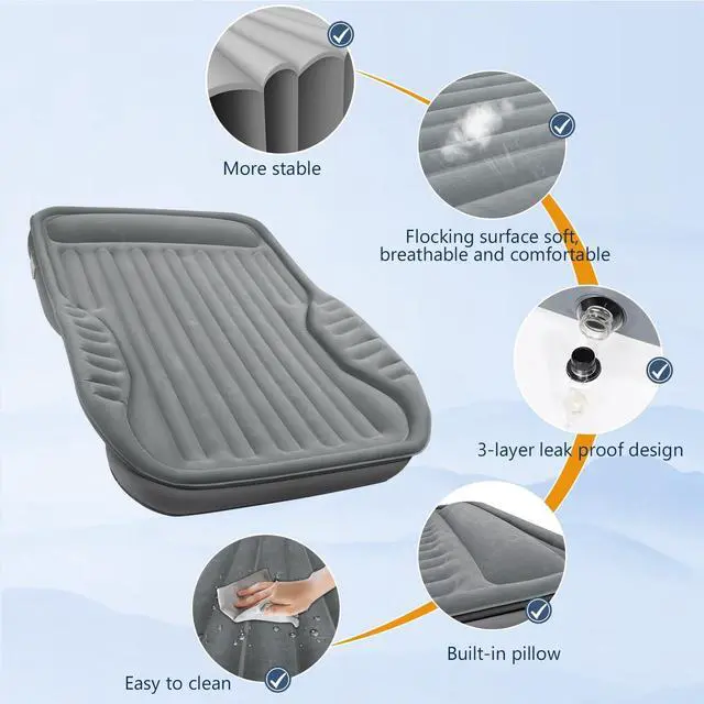 Multi-functional Air Mattress Featuring a self-inflating design, the car mattress is easy to pack and unfold. Whether in your SUV, RV, truck, or set up in your living room or at a campsite, this air mattress adapts seamlessly to your needs. falseRaised Head Design & 'Air Mattress Wings' Featuring a 9-inch built-in pillow for ergonomic comfort, the mattress also includes unique 'SUV Air Mattress Wings' that snugly fit around the wheel arches, ensuring full-body support. falsePremium Service Guarantee We ensure that all SUV air mattresses undergo a 72-hour air leakage test and a functional test for the built-in pump before packaging.