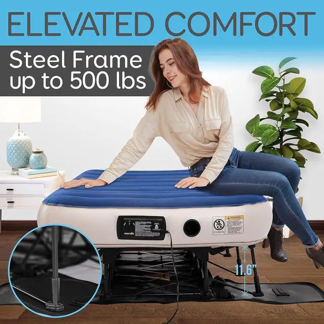 - MADE TO LAST: Air mattress with frame with sturdy PVC and powder-coated steel legs, this premium air mattress frame will surely prove its longevity. Air mattress cot also features enhanced coil technology constructed with I beam materi