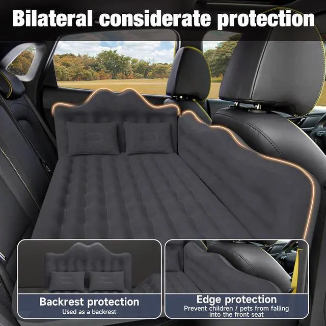 - PREMIUM FABRIC: Our car air mattress is made of thick flocking and premium PVC materials, ergonomic design, offering outstanding durability and waterproof performance, provide skin-friendly comfort. The texture surface and sturdy construction make it shock absorption, The child's anti-drop design prevents your child or pet from falling into the front row while driving