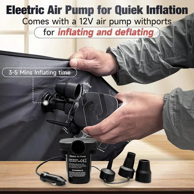 INFLATION AND DEFLATION: Equipped with car power fast charging electric pump for air mattress, quickly inflate or deflate through different ports, 12 volt DC power plug, Used to connect car power socket, Open exhaust valve, Press and discharge air, Double-layer air nozzle, let The air can only enter, And it can be inflated quickly and easilyfalseCAR