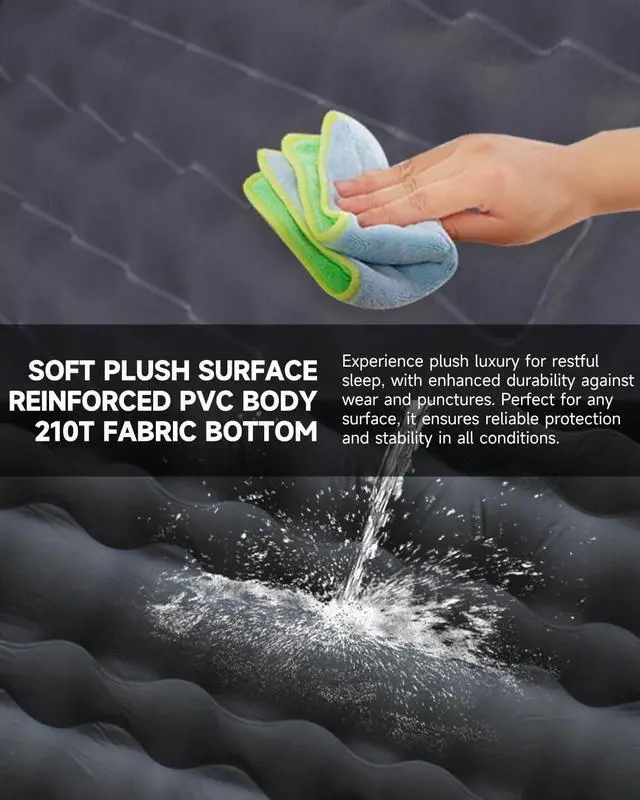 Premium Material: Our air mattress features thickened PVC fabric, ensuring exceptional durability and leak-proof performance. Enhanced with a plush velvety surface, it offers a comfortable touch and maintains waterproof quality. Whether for outdoor camping or indoor use, it provides reliable comfort and peace of mind.