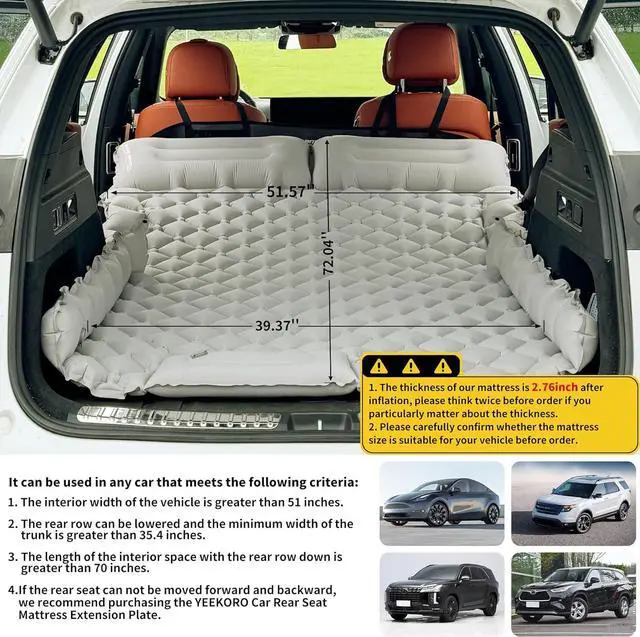 - TIPS: YEEKORO car air mattress is not only limited to SUV, Model 3/Y, but also can be applied to other types of non-compact cars or as a temporary bed for outdoor activities, before purchasing, please measure the size of your car and carefully compare the detailed size chart, please buy with caution! If you have any quality problems, please feel free to contact u