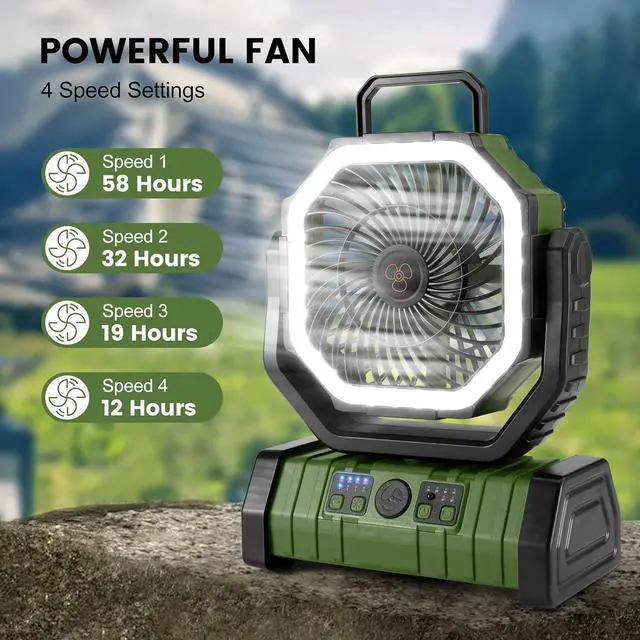- Powerful and Quiet WindOdoland camping fan has 4 different speeds, designed to provide powerful cooling without an irritating noise. The maximum wind speed is 15 ft/s. It can work continuously for 58 hrs in speed 1, 32 hrs in speed 2, 19 hrs in speed 3, and 12 hrs in speed 4.