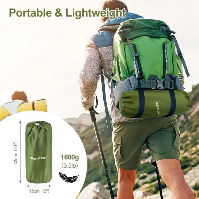 Double Built-in PillowsTwo separated pillows, no need to worry about any movements that might bother your partner. The Foot pump also thoughtfully designed in the middle, both sides can stretch your feet freely. Night Cat Inflatable Sleeping Pad provide better sleeping quality for you at outdoorsUltralight & CompactWith a portable carrying bag, packed size 15x33cm6"x 13", only weight 1600g( 3.5 lb), this lightweight camping air pad can be easily packed into your backpack, bike or car, and take to anywhere such as garden, park, mountain, beach for outdoor activities.