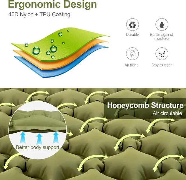 - Comfortable & DurableInflated size 195x120cm(77"x 47"), with built-in pillow. Hundreds of the honeycomb air cells can distribute your body weight to provide better support, no limit for any sleep position. TPU coated nylon fabric makes the sleeping mat less noise but more durable, also buffer against hot or cold air from the ground.