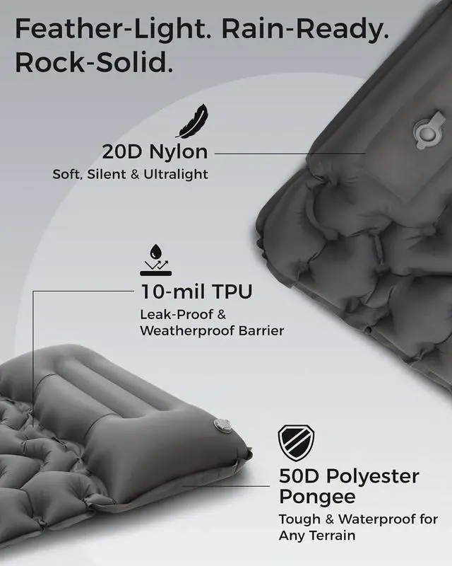 MORE COMFORTABLE THAN 40D: Our 20D nylon, paired with 10-mil TPU, is lighter, softer, and more comfortable than the standard 40D nylon found in many other sleeping pads. While 20D nylon costs more, it reduces weight without sacrificing durability or comfort. The result is a quieter, more flexible surface that enhances your rest while cutting down on bulkperfect for lightweight backpacking without compromising quality.