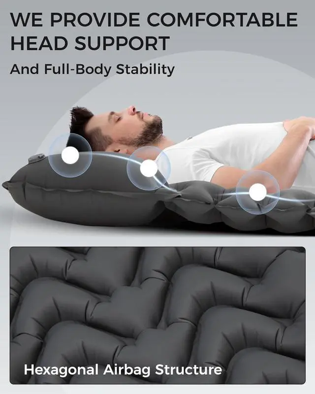 TOOLS REQUIRED: Forget the pumpsimply step on the built-in foot pump to inflate the pad in just 30 seconds. Perfect for outdoor settings with no access to power, this hands-free inflation system saves time and effort. When its time to pack up, just open the deflation valve, and it quickly releases air for easy storageULTRALIGHT & PORTABLE LIKE A WATER BOTTLE: This inflatable sleeping pad is ultralight and compresses down to a compact size of 11.8" x 5.1", similar to a water bottle for easy carrying. Its sleek, space-saving design fits effortlessly into your backpack, making it perfect for backpacking, hiking, camping, traveling, and all outdoor activities where lightweight and portability matter. No extra bulk, just comfort on the goGET ONE MORE FOR A TWIN BED EASY CONNECTION FOR EXTRA ROOM: Need extra space for a partner or family? Thanks to the side fasteners, you can quickly connect multiple pads to create a comfortable twin-sized bed. Simply click the clips, and you have a larger surface to accommodate two sleepersperfect for couples or families looking to maximize comfort in the great outdoors- EXTRA WIDE & 6.3 -INCH THICK SLEEP SUPPORT ENJOY RESTFUL COMFORT: Designed for ultimate comfort, this sleeping pad offers an extra-wide 77" x 27" x 2.4" surface and a 6.3" inflatable pillow for optimal neck support. The 2.4 -inch thickness provides the perfect cushioning to keep you off the ground, while maintaining a compact and lightweight design. With an ergonomic shape and wave-pattern surface, it evenly distributes pressure for superior support, ensuring a restful night outdoors.