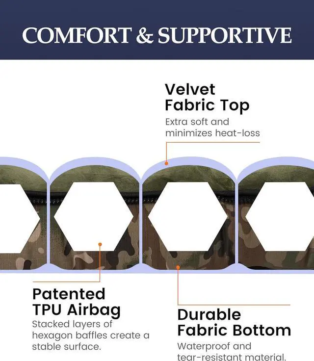 - PATENTED HEXAGONAL SUPPORT: The patented hexagonal airbag design creates a stable surface, offering unmatched comfort whether you sleep on your back, side, or stomach. It allows you to freely adjust your body balance and comfort. With 4.75 inches of extra thickness, it keeps your body elevated from the ground, providing insulation from the cold and ensuring a restful nights sleep