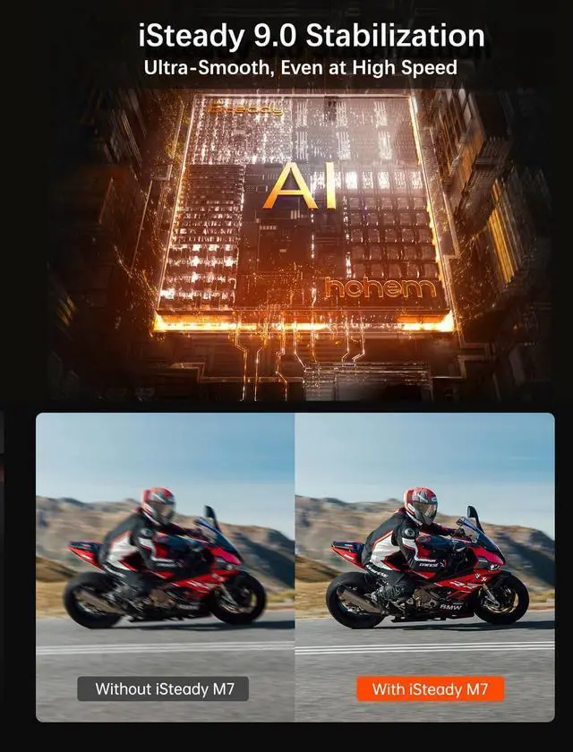 - iSteady 9.0 Stabilization: AI-powered iSteady 9.0 stabilization delivers unmatched anti-shake to adapt the footage to your speed. Whether walking, running, or capturing high-speed motion, the M7 will smooth out your video.
