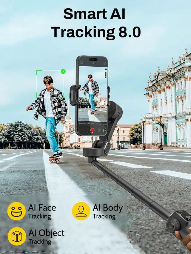 Ideal for vlogging, interviews, and content creation when you need reliable framing without an assistant. false- Upgraded Stabilization for Smoother Footage. Smart V8 smartphone gimbal features enhanced 3-axis stabilization, delivering smoother and more stable shots compared to previous models. Whether walking, panning, or tilting, your footage stays cinematic and shake-free.
