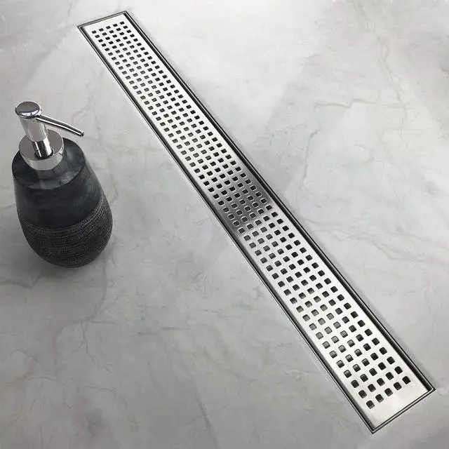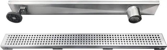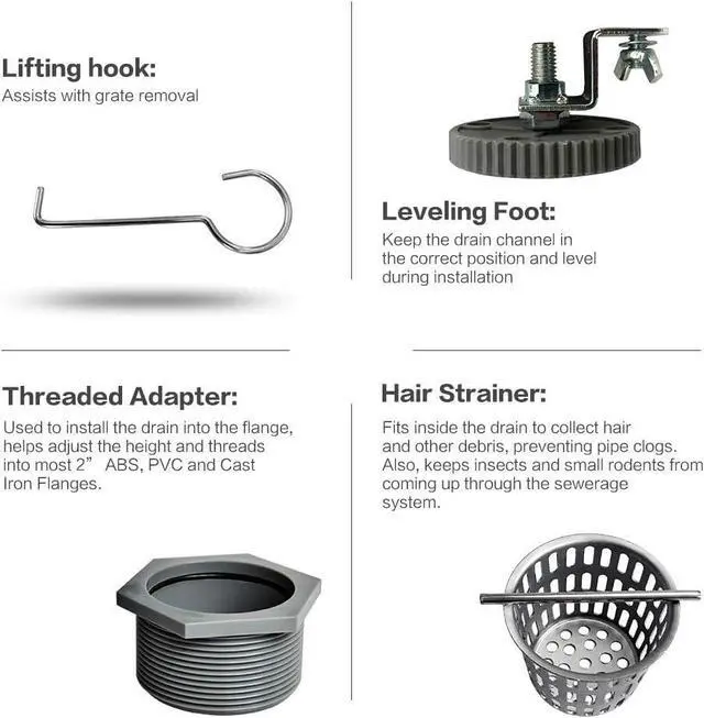 - Easy Adjustment: Linear drain equipped with adjustable feet on both sides, making the linear drain can easily be adjusted precisely to level to the ground. Threaded Adaptor with rubber O-ring aids adjusting the height of linear drain and securing the linear drain to the flange, leak-proof and compatible with most 2 PVC, ABS, and Cast Iron Drain Base FlangesA removable grate makes it easy to clean;