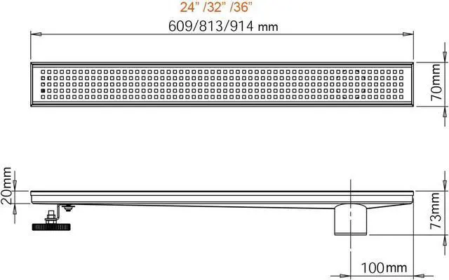 - Linear Shower Drain Size: 36" length, 2.75" width, 2" Side outlet. 36 L/min High Flow Capability.