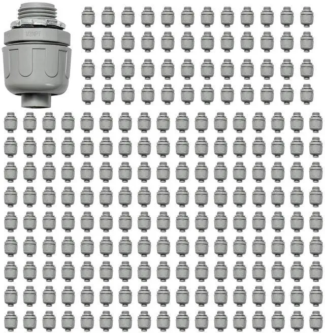 [Product Contains] Main body, domed nut, O ring, and steel locknut are included in the package. 180 Degree connectors in all, 200-PK. false[Superior Quality] All of these connectors, File No. E359420, are UL listed. You can use it with confidence. false- [Durable Material] Liquid-tight non-metallic PVC conduit fittings connectors are made of nylon 6, which is impact resistant, rust-resistant, resistant to oil, sea water, and mild acids. It resists strong tensile forces as well, so don't worry about the parts coming apart.