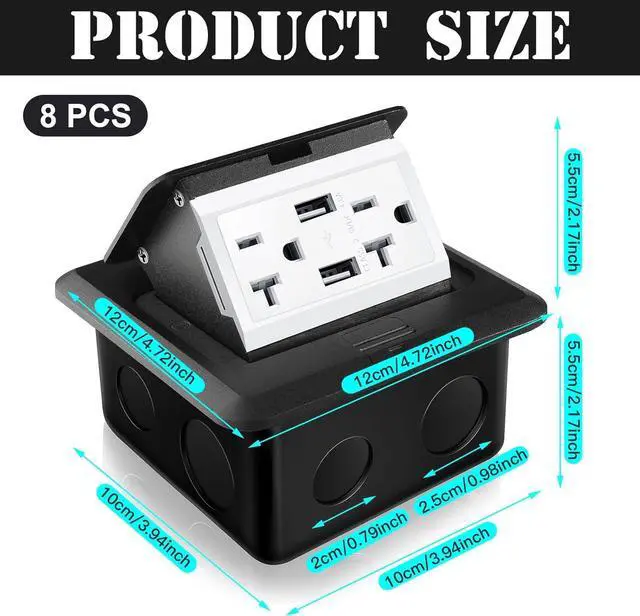 Size Information: the outdoor electric outlet box measures 10 x 10 x 5.5 cm/ 3.94 x 3.94 x 2.17 inch, the size of the square metal above the ground is 12 x 12 cm/ 4.72 x 4.72 inch, the height of the socket up state is 5.5 cm / 2.17 inch, and the package comes with 8 pack of electrical outlet boxes with sealing washers, mounting screws and junction boxes, and outlet boxes have 2 20A tamper resistant receptacles and 2 4.8A USB charging ports