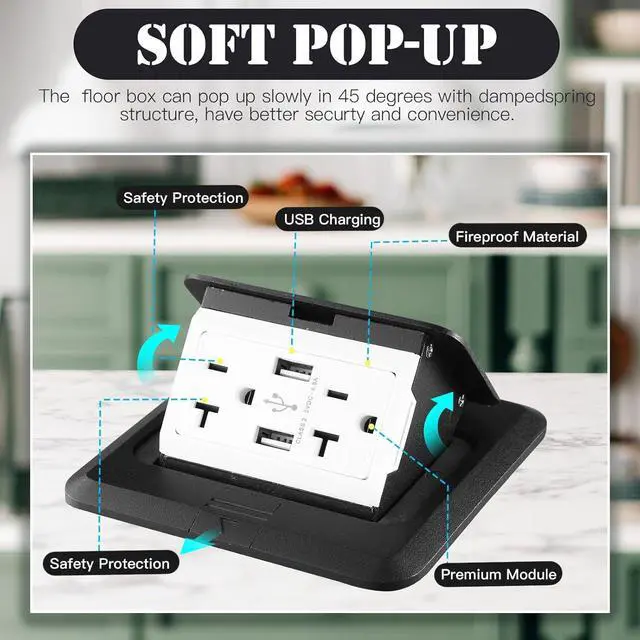 Use: the kitchen push up outlet is great for you to install on the hardwood, carpet, tile flooring applications, granite or marble kitchen countertops, tables or other places in residential or commercial environment, which will not take up so much space and keep the places tidyfalseEasy to