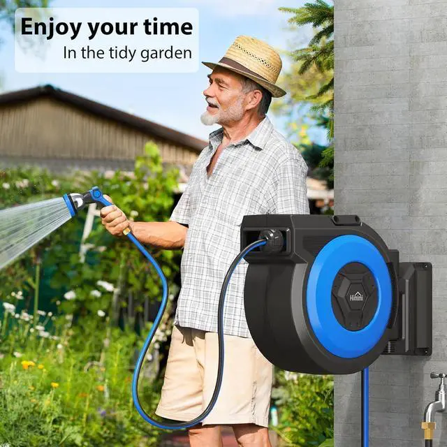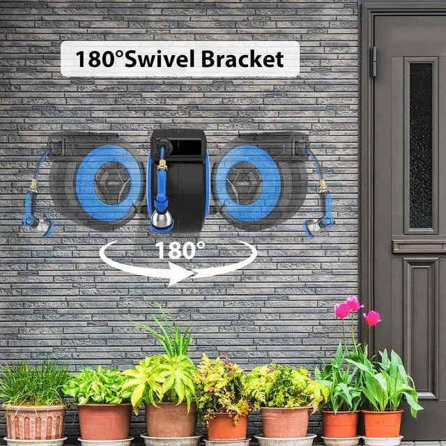 Superior Case ConstructionEngineered for long-lasting performance, the garden hose reel can withstand even the harshest summer heat and cold winter. In addition, the case is constructed from impact-resistant, lightweight and durable polypropylene housing. Extends the life of your retractable garden hose while maintaining its appearance and performancefalse10-pattern NozzleThe water hose reel have 10 patterns nozzle, whice available to have different spray ways, includes shower, center, flat, soaker, mist, jet, triangle, rinse, 1/2vert and cone, meet various watering needs of customers. The nozzle has been upgraded to adjust the water pressure and you dont have to hold the switch all the time when using itfalse180° Swivel BracketWall mount hose reel Included in the package is a rotatable bracket that can be securely affixed to sturdy walls or wooden stakes to achieve 180 rotation, Meeting your multi-directional watering needs.