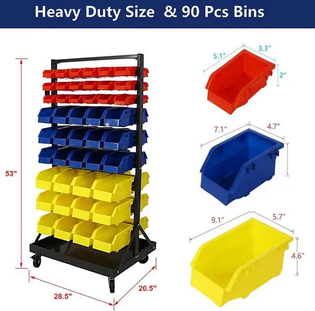Efficient Storage Solution: Our 9 tiers garage storage bins is designed to maximize storage capacity and organization for your home tools and accessories. With 90 durable polypropylene bins, you can easily sort and store your items.
