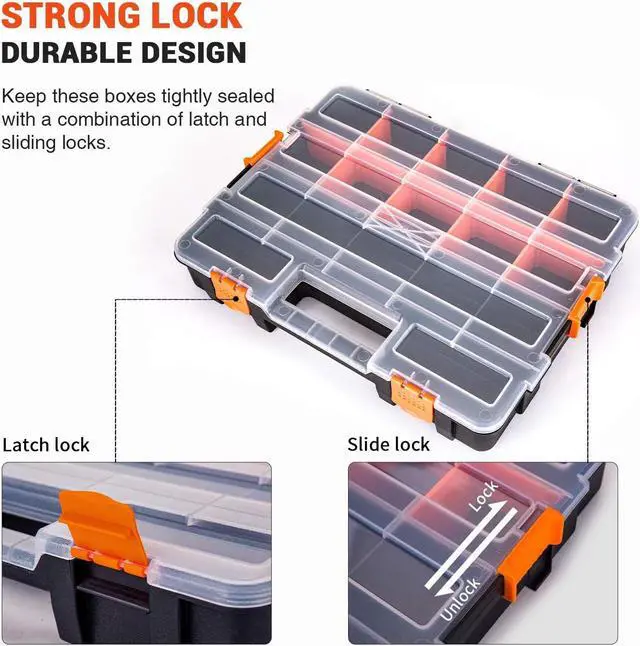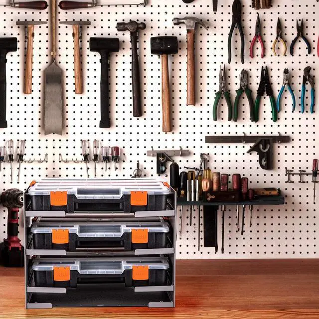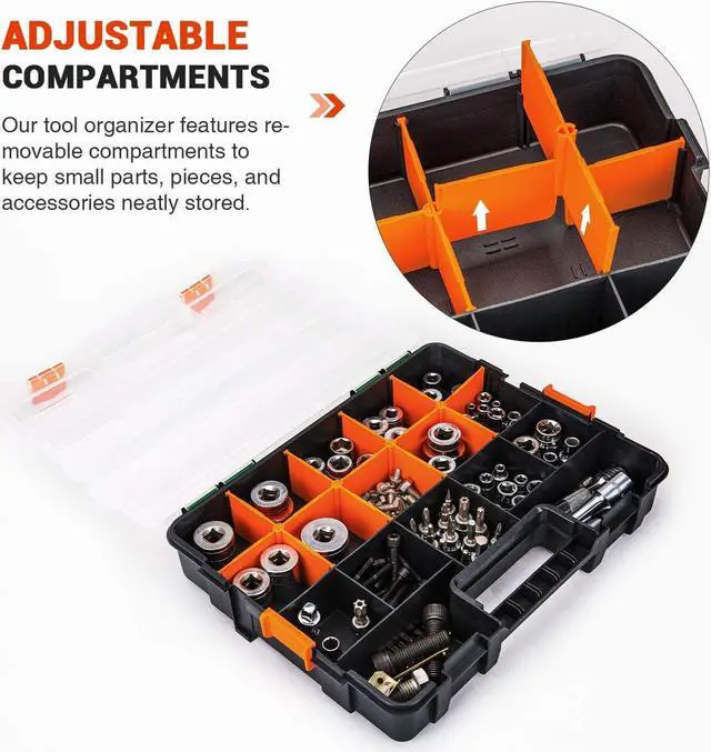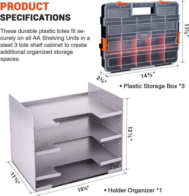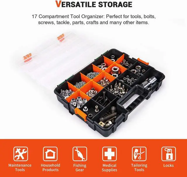 Tote includes 17 Small compartmentsfalseGreat for muti-purpose use in shop, home, garage and outdoorfalse- Includes 3 Plastic Hardware Organizer Totes