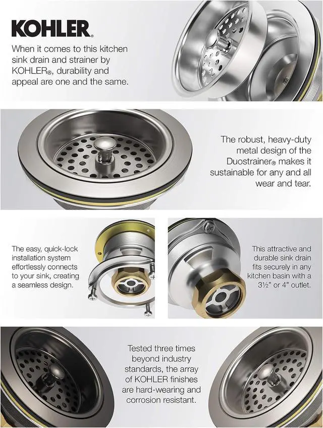 Brass constructionfalseKeep your sink draining smoothly with this complete Duostrainer sink strainer. With an integrated tailpiece for convenient installation, and basket featuring an easy-to-use open/close stopper, this strainer system offers everything you need. Available in an array of KOHLER Finishes to accent any decor.