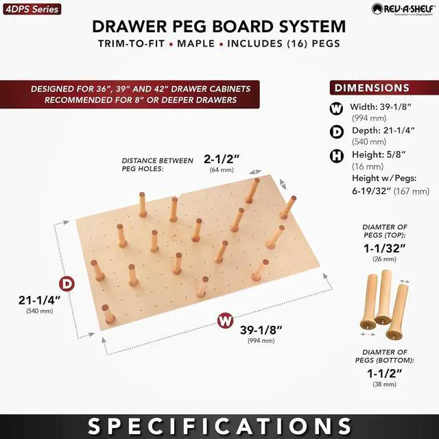 - Easy Drawer Board Install: Includes 1 wood peg board insert and 16 wooden pegs; Unit is designed for easy drop-in installation and can be trimmed to custom and precise fit with a table saw